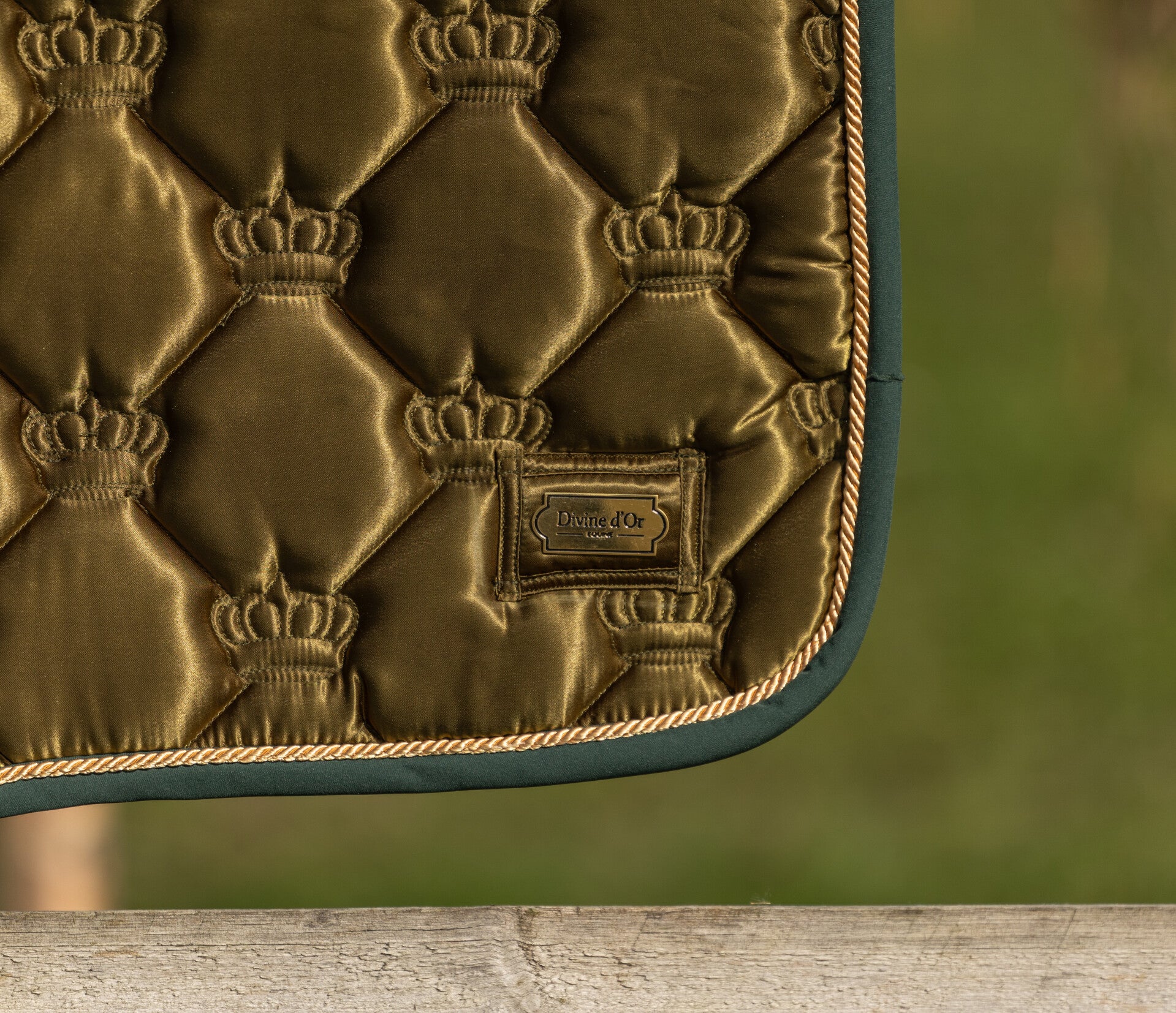 Ervaar de betovering van het Emerald Allure zadeldekje. Dit diepgroene dekje, verfraaid met een gouden omranding en een elegant kroontjespatroon, straalt het allure uit. Het zachte, schokdempende materiaal biedt comfort voor uw paard, terwijl de brede voorzijde en stevige singelriemen zorgen voor extra ondersteuning van het zadel. Het Emerald Allure zadeldek is beschikbaar in zowel spring- als dressuuruitvoering, zodat u altijd de perfecte pasvorm heeft voor uw discipline. Beschikbaar in Pony, Cob en Full.