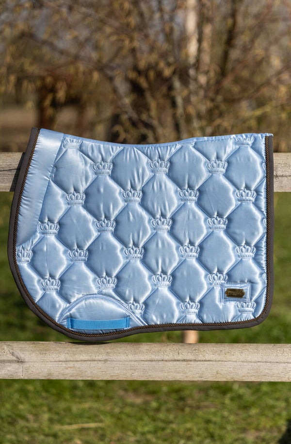 Breng een vleugje hemelse sereniteit in uw rit met het Sky Bliss zadeldek. De luchtblauwe tint, gecombineerd met een zwart-grijze omranding en een verfijnd kroontjespatroon, creëert een frisse en elegante look. Het zachte, dempende materiaal biedt uw paard maximaal comfort, terwijl de brede voorzijde en stevige singelriemen zorgen voor een stabiele en ondersteunende pasvorm van het zadel. Verkrijgbaar in zowel spring- als dressuurvariant.