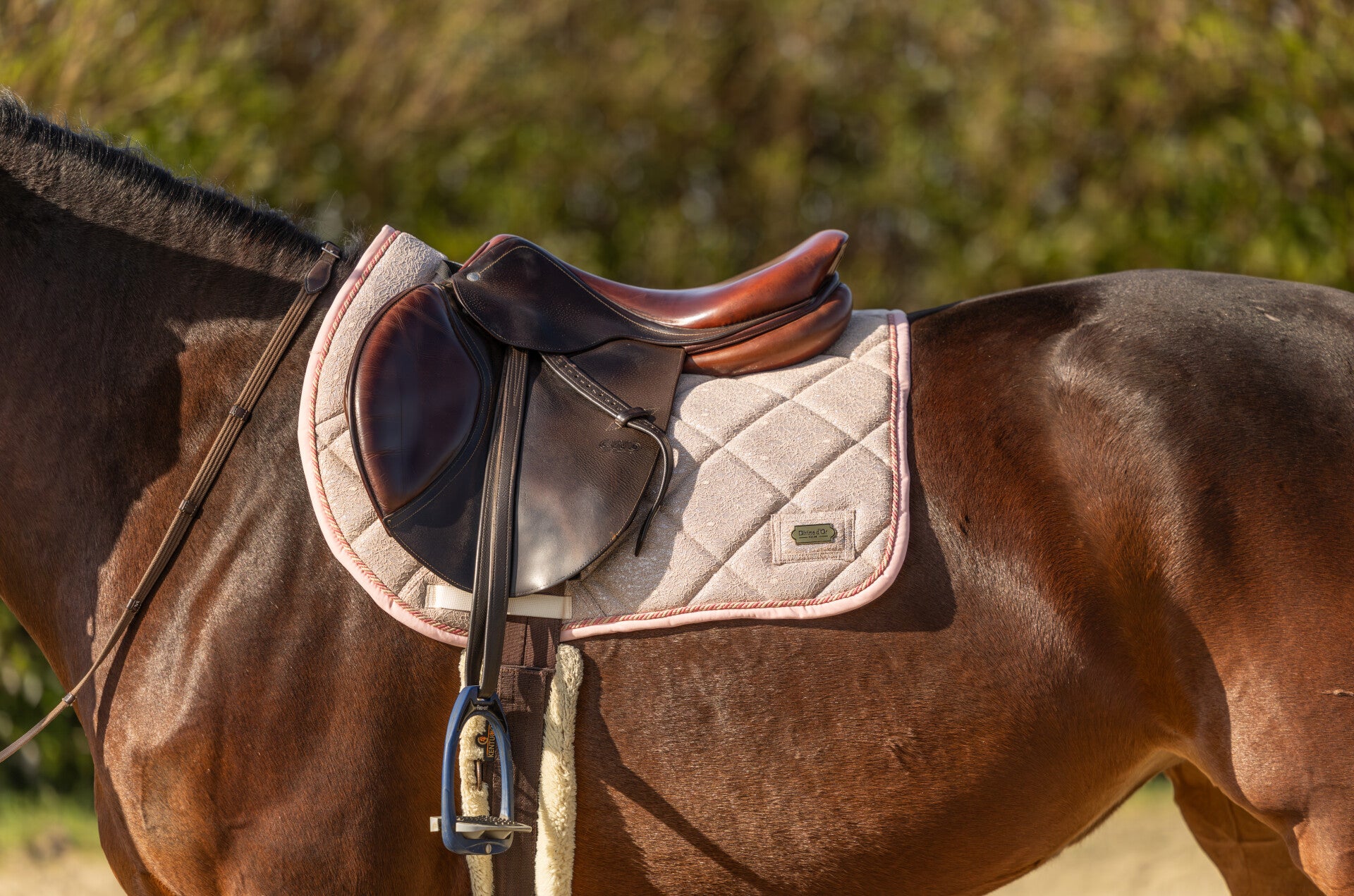 Voeg een vleugje verfijning toe met het Rosé Elégance zadeldek. Dit rosé-kleurige dekje, voorzien van een schitterende glitter en een bijpassende roze omranding, straalt pure elegantie uit. Het ruitjespatroon versterkt de klassieke charme. Het zachte, schokdempende materiaal garandeert het comfort van uw paard, terwijl de brede voorzijde en stevige singelriemen zorgen voor optimale ondersteuning van het zadel. Beschikbaar in zowel spring- als dressuuruitvoering.